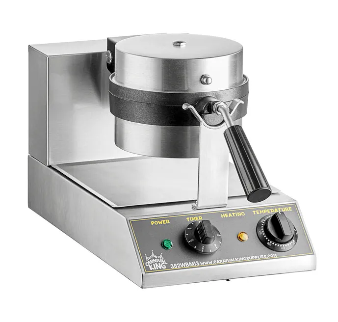 Prepara 20 wafles belgas por hora para seguir el ritmo de las prisas más ajetreadas. Las rejillas de cocción antiadherentes forman gofres perfectos de hasta 7 1/2" de diámetro sin que se pegue la masa. Las rejillas de cocción giran 180 grados para garantizar una cocción uniforme por ambos lados. La temperatura se ajusta hasta 570 grados Fahrenheit; temporizador sonoro de 5 minutos. La luz verde de encendido indica que la unidad está encendida; la luz naranja indica precalentamiento. Potencia 1.1 Kw. Funcionamiento eléctrica 115V/60Hz